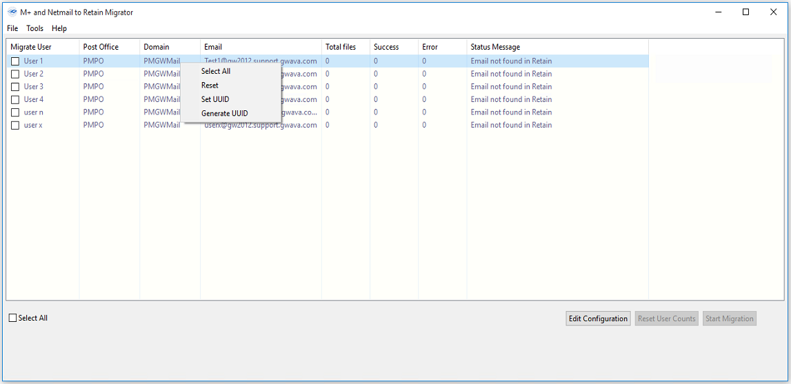 The interface has a few features, all accessed through the right-click menu. Users must be selected in the interface in order to be migrated. ONLY selected users will be migrated.