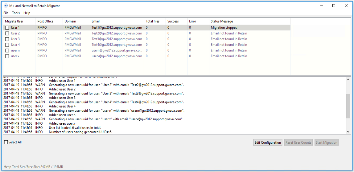 Logs contain all errors as well as migration info for all users. After setting up the Migration Context, a .conf file can be saved anywhere and will be loaded automatically the next time the migration tool is loaded.