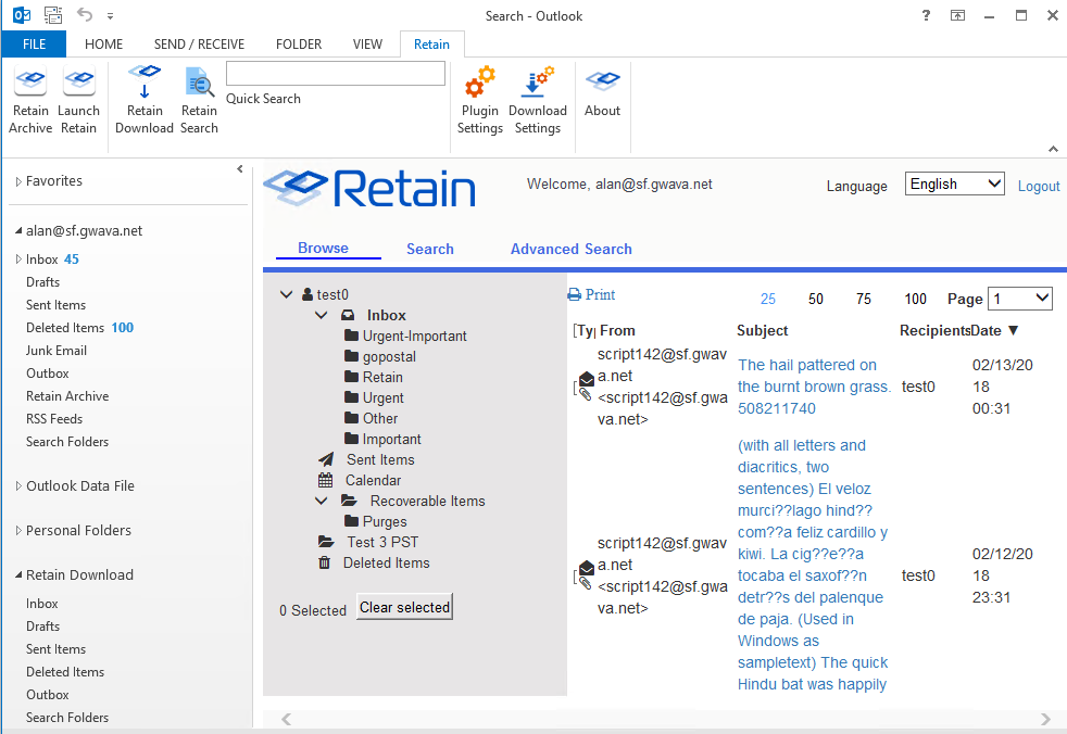 A new folder called Retain Archive will also be created at the Inbox level of your local folder. This will allow you to Browse or Search your Retain archive mailbox.