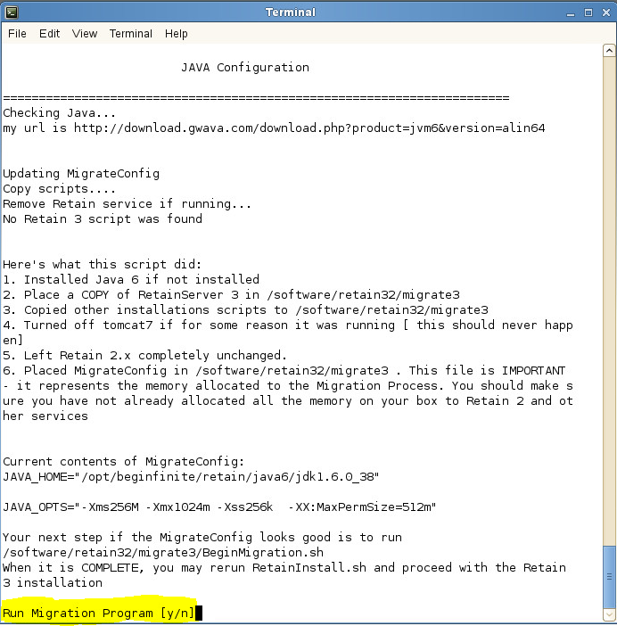 Type "y" to run the migration tool. It launches "BeginMigration.sh".