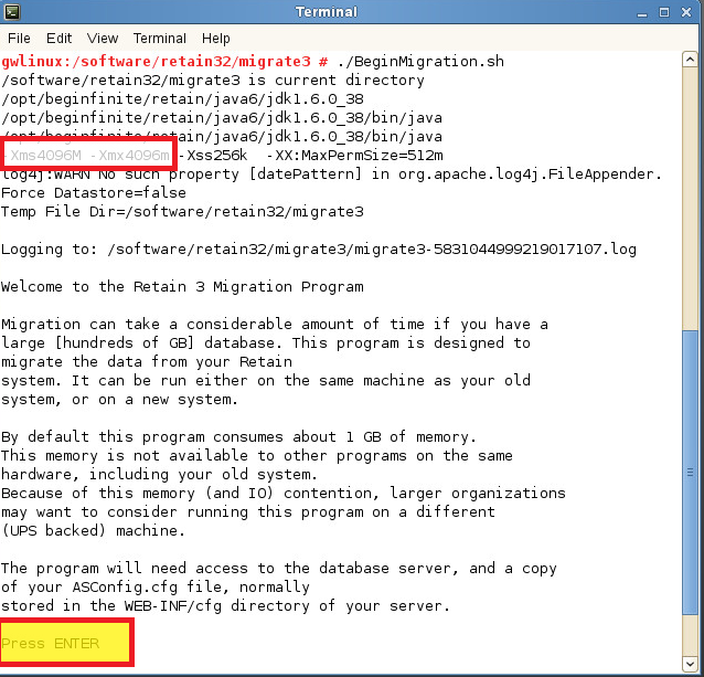 This sets the minimum and maximum Java memory heap value to 4G each. This will not work if you do not have 4G free memory on the machine (and you'll want to reserve at least 2 GB free memory for the OS), so be sure to check that before proceeding. If you are running the Migrator on the Retain server and you do not have 4G free, see how much is allocated to Tomcat and consider lowering it TEMPORARILY to free up space for the migrator. See " How to Adjust the Tomcat Memory Settings on Linux"; however, the ideal solution would be to add memory to the server itself.