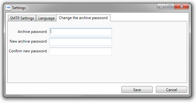The ‘Change the archive password’ tab allows access to modify the password of the current archive. In order to change a password on an archive, the original password must be supplied first. If there is no password on an archive, a new password may be created; simply leave the current password field blank and input the desired password in the provided fields. While passwords may be changed, or created, the requirement for a password may not be removed.