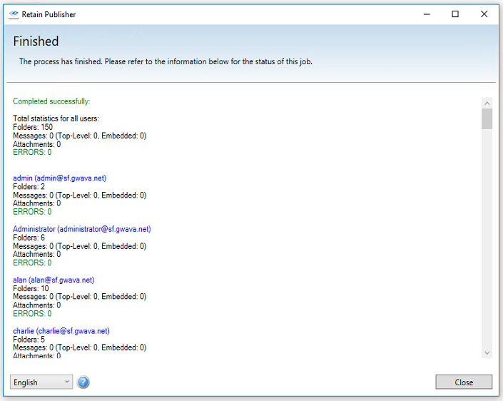 The Publisher will connect to the Retain Server and export the qualifying messages from the selected user(s) mailboxes and builds the local archive.