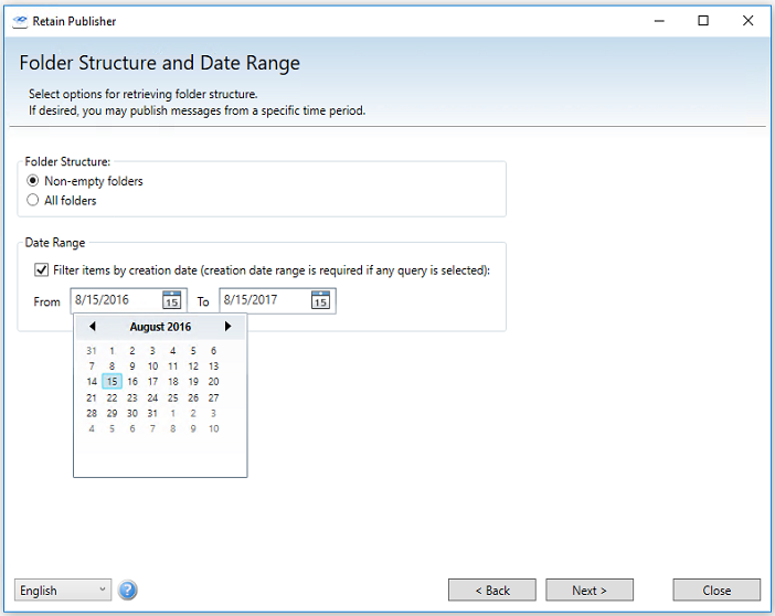 The Date Range allows for specific item date ranges to be selected or excluded. The query will cause the publisher to only look for the specific mail required within the specified time frame. The time range may have a start date, and end date, or both. This feature is disabled if a saved query is being used.