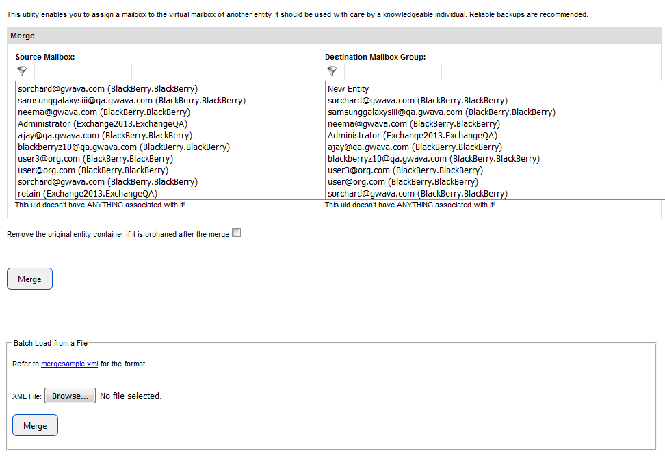 Manually merging and splitting mailboxes is repeatable and is also the only way to undo a merge, automatic or otherwise. A batch load may be created and processed, but requires specific formatting, see the ‘mergesample.xml’ for format information.