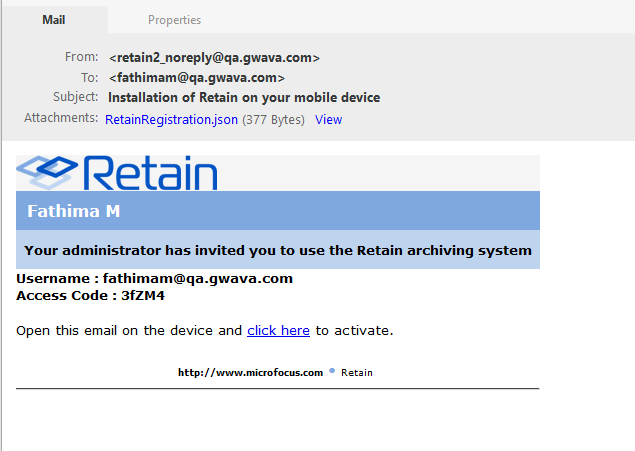 Retain creates an email which contains an activating link. Users need to open this email and follow the link on their mobile device. The link should be activated through the Retain application on the Android device. Therefore, the RetainService application must be installed on the Android device prior to clicking the activation link.