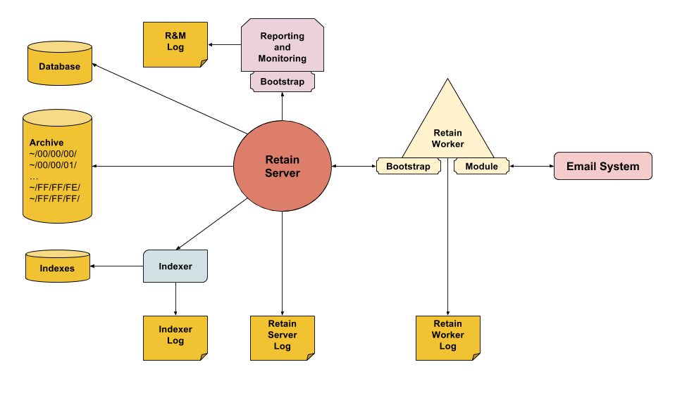 Since Retain is an archiving solution, it will happily fill up your storage system. While it will warn you of impending doom, it is up to you to keep bad things from happening like the hard drive filling up completely. It is difficult to recover from that since not even the OS works very effectively under those conditions. You need to design in the ability to add extra storage easily. Retain stores data in the archive, database and indexes the data for search. Retain also logs what is happening for auditing and troubleshooting purposes.