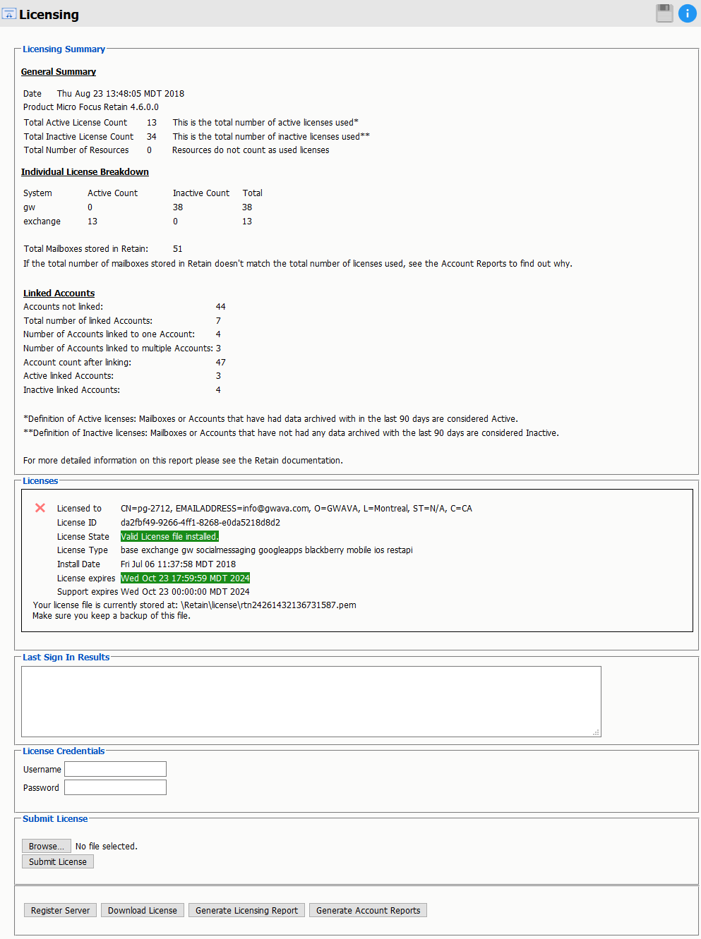 License Count is the number of users archived by Retain. Only mailboxes that have been archived will be counted as active or inactive, not every entry in the mail system's address book. Mailboxes are marked as inactive if no new data from that mailbox had been archived in the last 90 days.