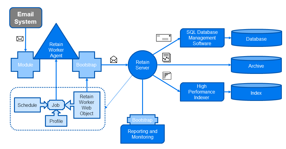 Worker: The Worker is a combination of the Retain Worker Agent that can sit on the Retain server, the messaging server or another server, and the Retain Worker Web Object in the Retain Server console where you create the worker bootstrap which tells the Worker Agent how to connect to Retain Server.