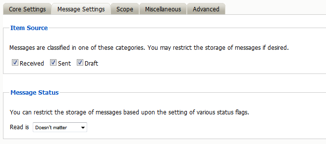 The Message Settings tab contains the source and status settings for the messages to be archived. Message types and sources which are checked will be archived in this profile.