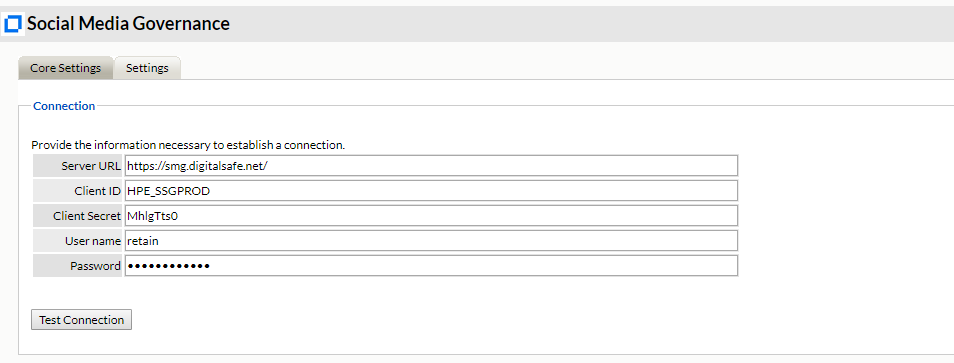 The Social Media Governance module allows Retain to archive Social Messaging communications. Retain integrates with Micro Focus Social Media Governance (SMG) for the archived Social Messaging communications. You need to know the SMG server URL and then the Client ID, Client Secret, User name, and Password provided to you when you purchased SMG to connect Retain to SMG.