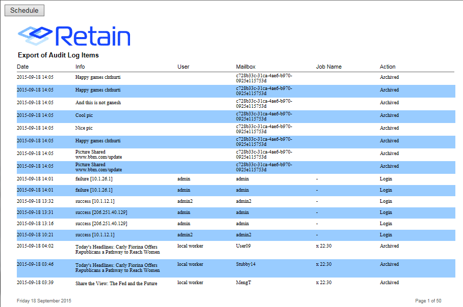 The Audit User Activity report details the different actions performed in the Retain system by different users. This report is a detailed list of all auditable actions taken and which users took them in the Retain system.