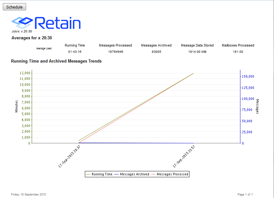 All reports under the ‘Report’ menu except ‘Job Run Mailbox Summary’, can be scheduled and have a ‘Schedule’ button at the bottom of the delivered HTML report. Selecting this button copies the settings used to generate the visible report to the Schedule Report interface. This convenience is designed to allow rapid fine-tuning of reports to deliver the desired information. First select the report you wish to run, and then fine-tune the report until it reaches the desired effect. Once the desired settings have been achieved, select the ‘Schedule’ button from the bottom of the report to carry all settings into the corresponding ‘Schedule Report’ interface, and schedule the report.