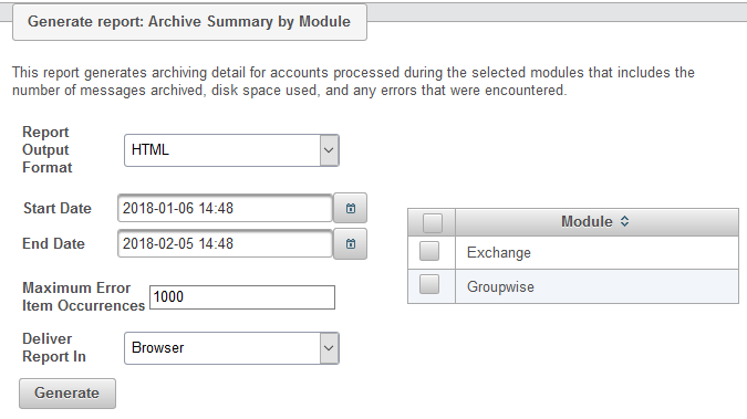 The Reporting and Monitoring module will automatically copy the SMTP configuration from the Retain Server. If this information is not correct, it should be configured here before selecting the ‘Generate’ button.