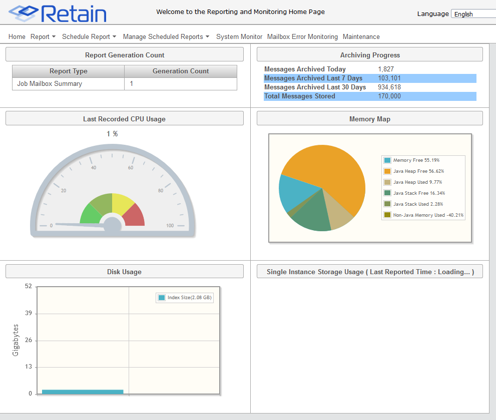 The system CPU load, memory usage map, and Disk Usage are displayed. The dashboard also contains statistics for disk space saved through single storage instances. These numbers are for the actual host server, and not just the Retain system, with exception of the memory map, which has both. The Memory map is broken out to total system memory free and used, but also includes Java memory statistics – which will be Retain specific unless additional Java applications are running on the Retain Server. This page will not time-out or expire, to allow quick monitoring of the system.