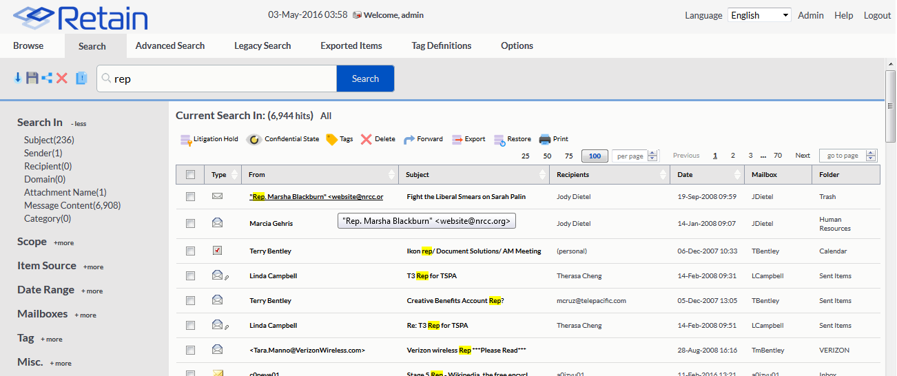 The search in Retain 4 is designed to work much like a Google search, with anticipated auto-correct search terms. The Search tab will allow searching across the entire Archive for administrators, while users will only be able to search their own archive.
