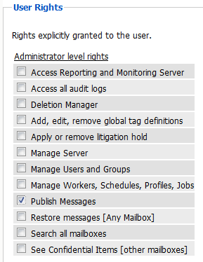 The Administrator account for Retain automatically has the publish messages right, and can be used here, though it is highly recommended to create and use an auditor account with the mail export right and access to the desired mailboxes or post offices required.