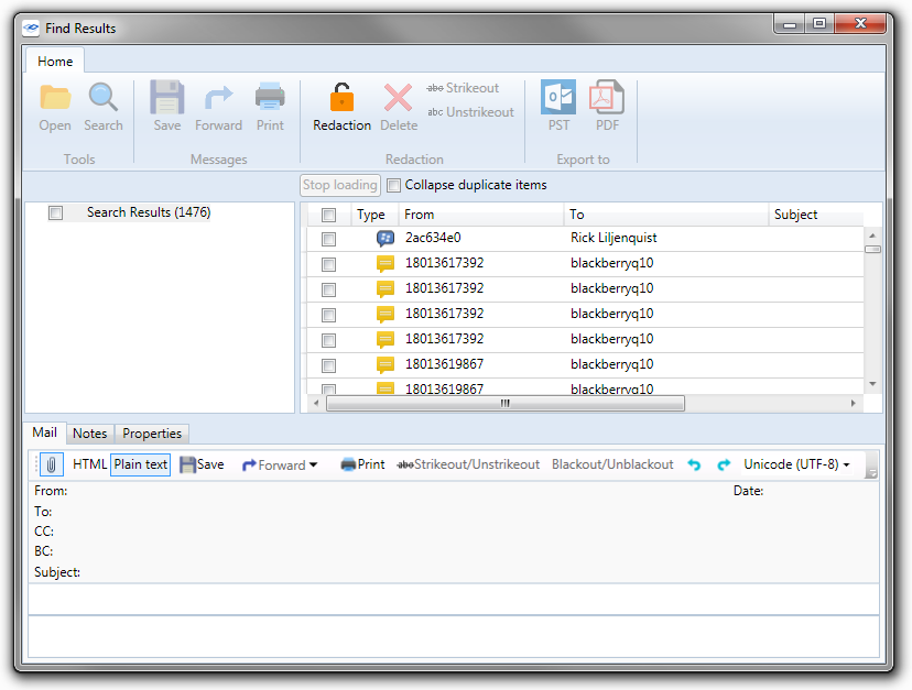 When Redaction is enabled, the ‘Strikeout/Unstrikeout’, ‘Black out’ options, and ‘Notes’ tab become active. The Notes tab works much like a notepad that is always connected to the archive. Items of interest or whole messages’ texts can be copied and compiled in the redaction notes. Messages with notes on them are marked in the archive viewer with a notepad icon in the message list.