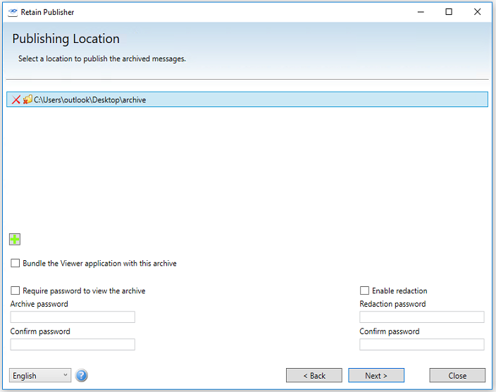 The messages extracted from the Retain Server will be saved in a database at this location. Select an existing location or select the green plus button and then browse to, or create a new folder for the published archive destination. If a destination is selected which already contains an existing archive, a warning of overwriting an existing archive will be displayed.