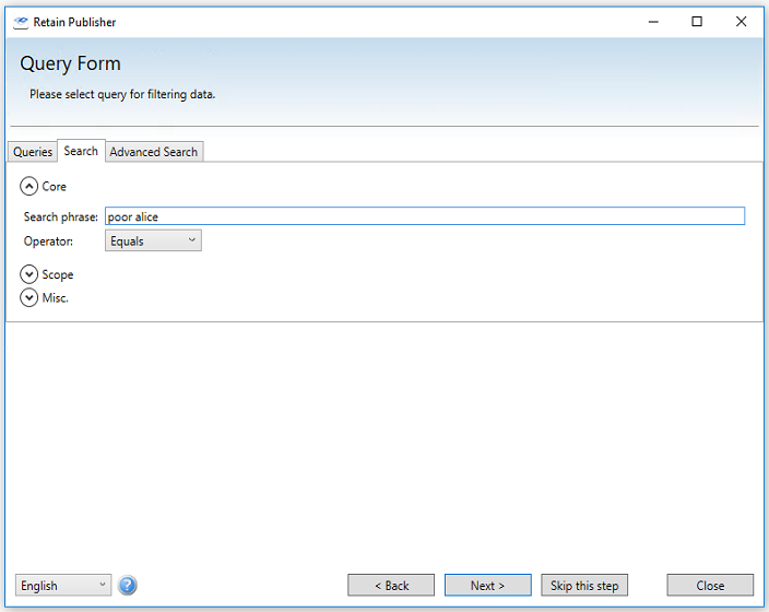 Select or create a query to filter the scope of the export job. There are three tabs but you only need to use the one you need to build the query. You can use a query saved in the Retain Web console, a simple search or an advanced search.