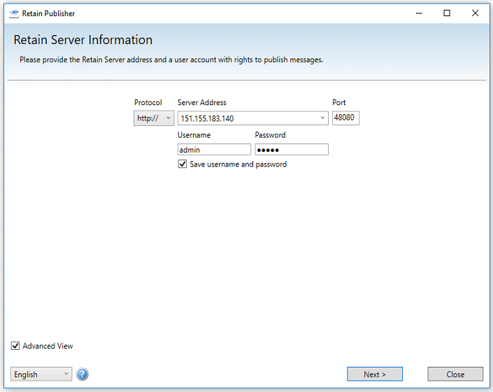 The Publisher must be used in conjunction with a user that has administrator rights to publish messages. Because the Publisher connects over the network, it requires an open network connection to the Retain Server.