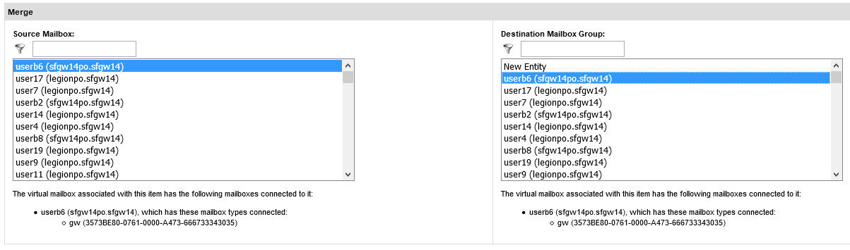 To merge two addresses, first select the source mailbox and then select the destination mailbox. After the desired mailboxes have been selected, click the ‘Merge’ button. A successful merge will show two entries under the source mailbox.