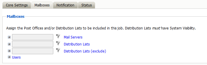 The mailboxes tab is where the administrator specifies which entities (mail server(s) and/or Distribution List(s)) are to be scanned. This tab is not displayed for the mobile module.