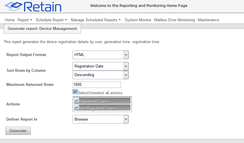 The Generate Report button will take open a new tab or window to the Reporting and Monitoring server and open a Device Management Report configuration page.