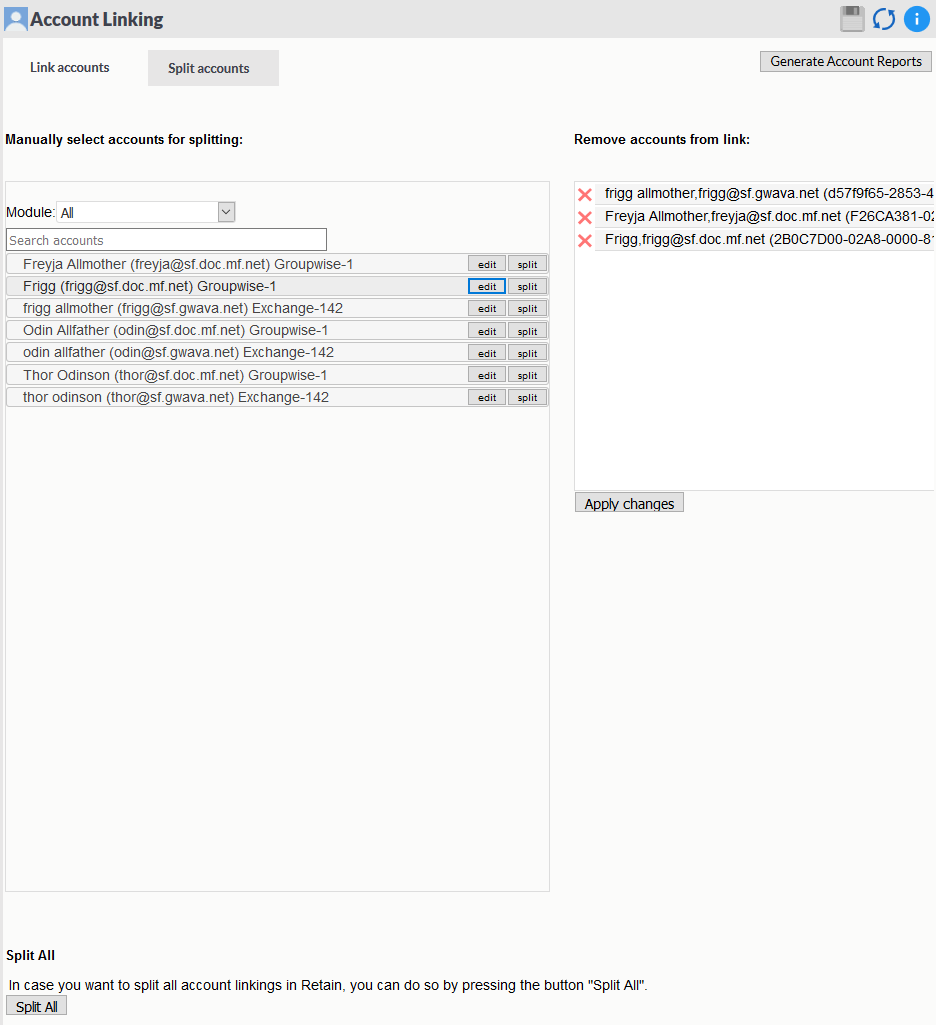 Press “edit” next to one of the accounts to load it into the “Remove accounts from link:” pane. For this example Frigg was added incorrectly to Freyja.