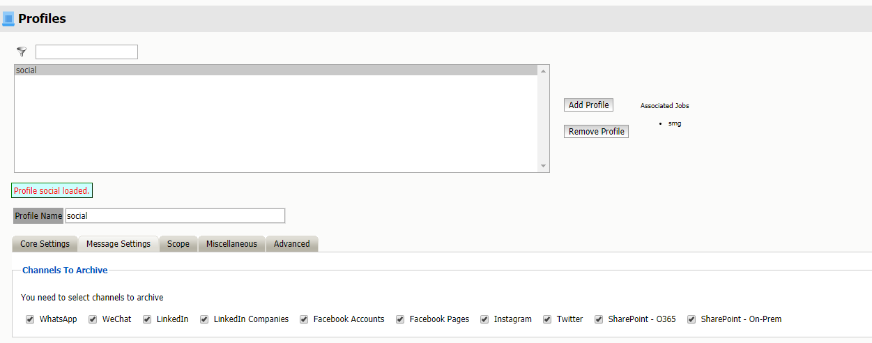 The Social Media Governance Profile allows the administrator to dictate what types of message data is collected and from which Social Messaging channels.