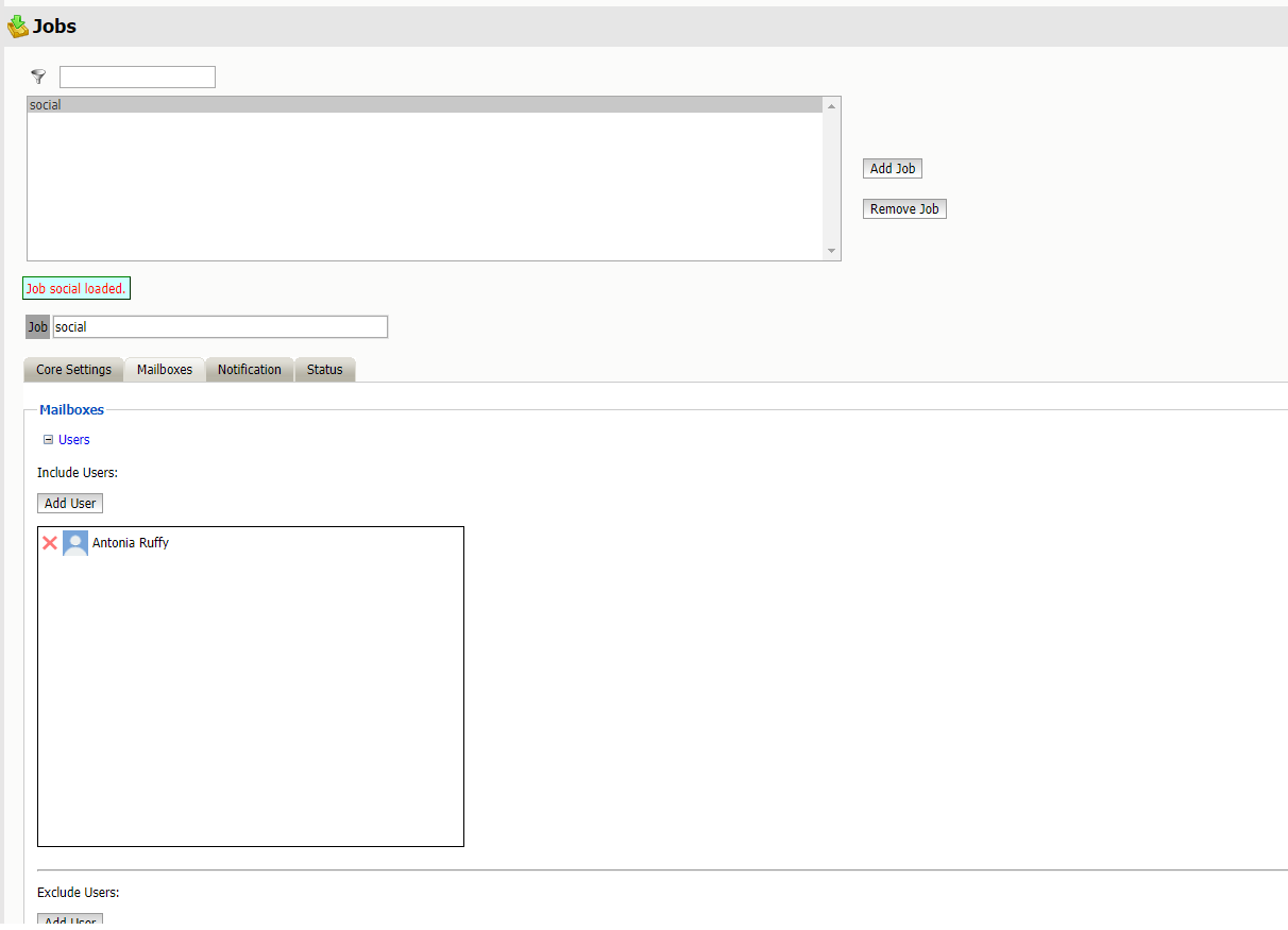 The mailboxes tab is where you connect the Job to the Social Media Governance Module. Add a Job and the users you want to archive.