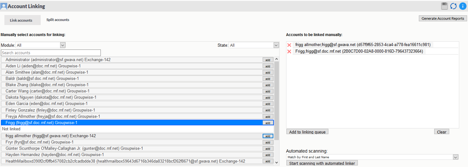 Press the “Add to linking queue” button to add the selected accounts to the linking queue. You may press the red X to remove a link from the queue.