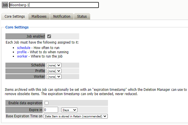 Path: Retain Server Manager > Data Collection > Jobs > Bloomberg > Select the Job > Core Settings