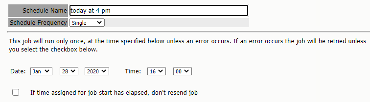 If time assigned for job start has elapsed, ... : As a general best practice, you should enable this option. This prevents Jobs from queuing up after their start time has passed. Otherwise, errors or schedule configuration adjustments can cause the system to redundantly resend jobs even though a schedule has technically expired.