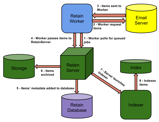 The Worker connects to the mail system and does a login to each mailbox. For every mailbox, it requests the items in that mailbox based on the settings in the profile.