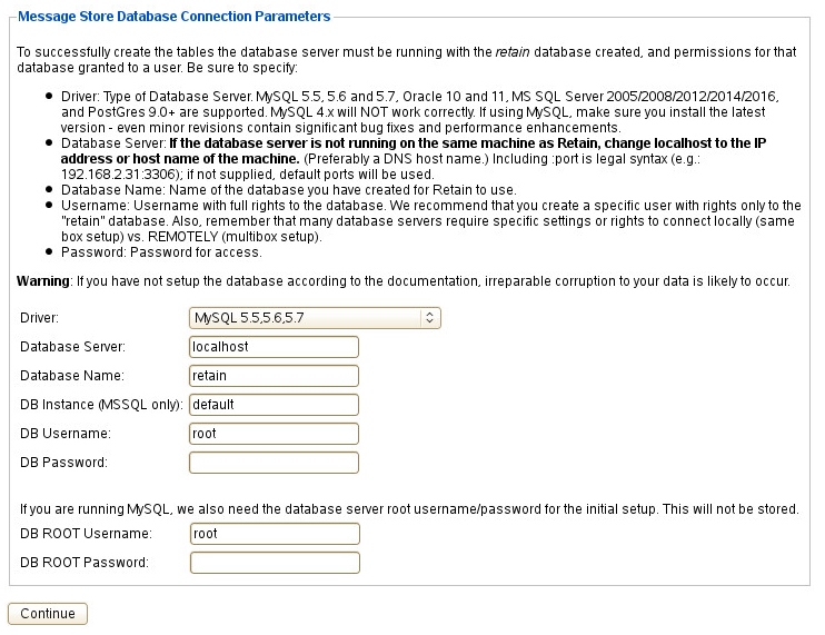 You will be prompted to provide SQL connection information for both the configuration and message store databases. For convenience and simplicity most installations store this information in the same database. The database(s) will be used to store Retain configuration, cached address books, and all saved message data.