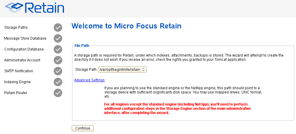 You are now ready to start your initial Retain configuration. Specify a storage path for Retain. Accept the default path unless you have a reason to choose a different one. See the next page for an important note about storage paths. If you are specifying a custom storage path, Retain must have rights to the location. For Linux instructions see Custom Storage Path Rights, at the end of the Linux install guide.