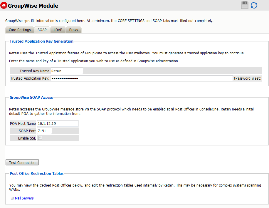 The SOAP access information must be provided, and the connection tested and verified before the system can connect. After providing the required information, click the 'Test Connection' button. The results are displayed. A successful result must be reached before Retain can archive messages from GroupWise.