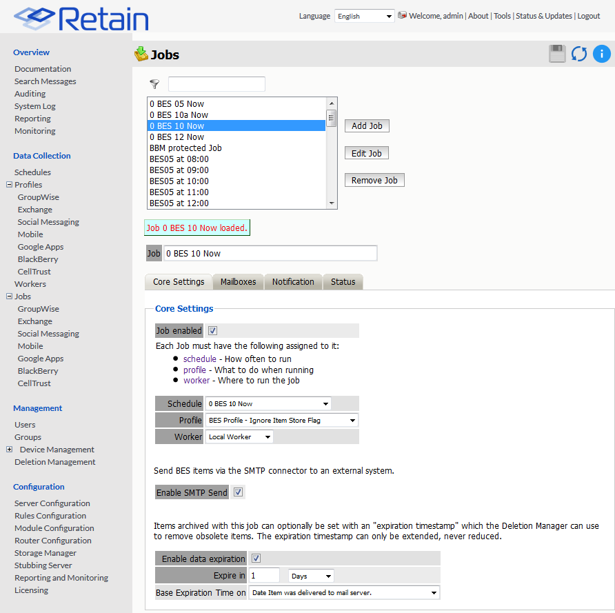 The core settings tab contains the basic configuration. Select the ‘Job enabled’ option to enable archiving. Also, select a Schedule, Profile, and Worker to complete the job. If the SMTP Send is enabled, the worker will forward BES message data.