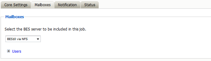 Under the Mailbox tab, select the BES server to be included in the Job. The list of available BES servers is configured from the Modules page. Once selected, all users associated or present on the BES server are included.