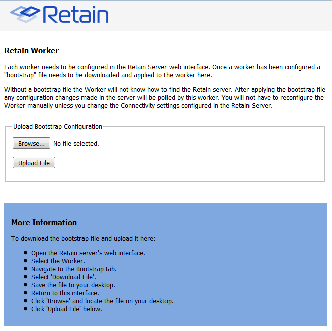 After creating the bootstrap file in the Retain Server Console you will need to upload it tot he Worker Agent Console so it can connect to the Retain Server.