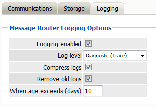 The logging tab contains settings to enable logging, dictate the logging level of the Router, and settings to purge old logs from the system after a specified age.