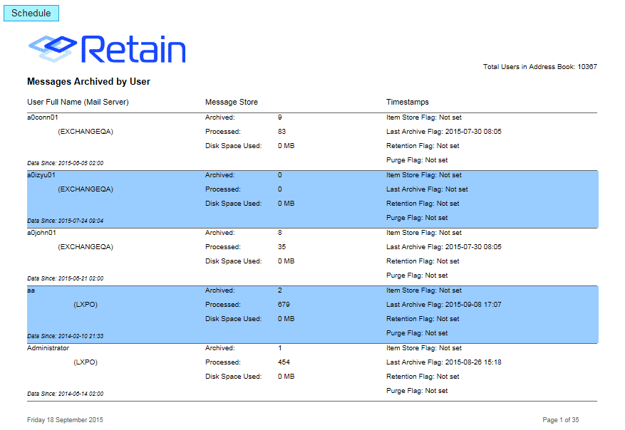 The report lists all users, a quick description of the action taken and how many times it was performed, and the date of the last time it was performed. Actions such as viewing an item, searching the archive, changing settings on either the server or in the interface, forwarding items, applying litigation holds, publishing items, etc. To take the same settings used when creating this report, select the ‘Schedule’ button to enter the Schedule Report interface with the same settings.