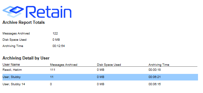 The Archive Summary by User report creates a summary of all users’, or a specific user’s, archive history. The summary includes all pertinent information for each mailbox’s archive over the last 3 months of jobs. To run the report, either all or one mailbox must be selected. If all mailboxes are selected, the maximum returned rows may be a very important setting to keep the report from becoming immense.