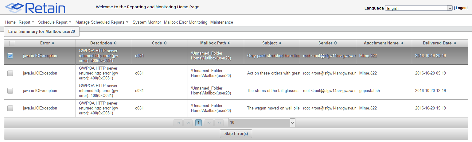 Mailbox Error Monitoring is a function that allows the Administrator to deal with message errors. The email system reports errors to Retain when there is an issue accessing a message. Sometimes these errors are transient and other times they are permanent. This function will help the Administrator determine the next action.