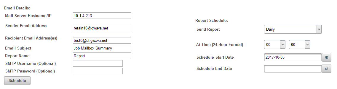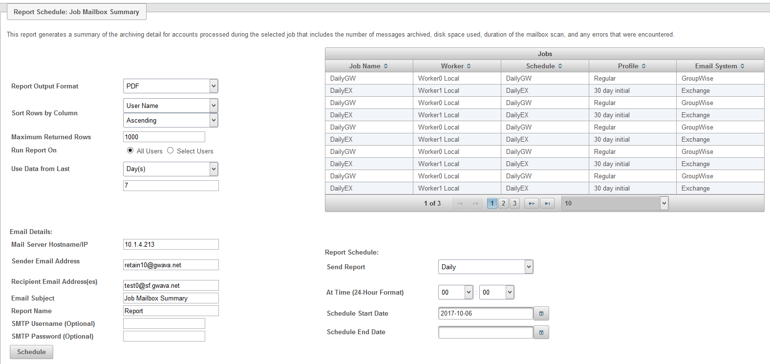 All reports under the ‘Report’ menu except ‘Job Run Mailbox Summary’, can be scheduled and have a ‘Schedule’ button at the bottom of the delivered HTML report. Selecting this button copies the settings used to generate the visible report to the Schedule Report interface. This convenience is designed to allow rapid fine-tuning of reports to deliver the desired information. First select the report you wish to run, and then fine-tune the report until it reaches the desired effect. Once the desired settings have been achieved, select the ‘Schedule’ button from the bottom of the report to carry all settings into the corresponding ‘Schedule Report’ interface, and schedule the report.