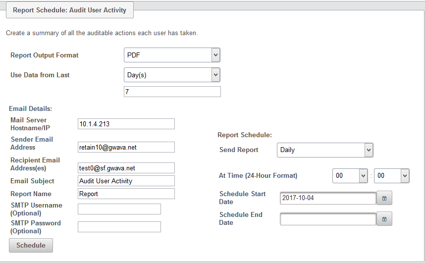 The Audit User Activity report details the different actions performed in the Retain system by different users. This report is a detailed list of all auditable actions taken and which users took them in the Retain system.