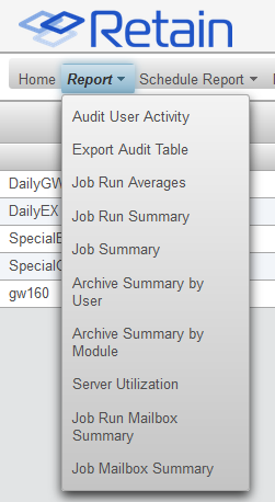 Report and Schedule Report functions are accessed through drop-down menus in the interface. To access the different reports, select the ‘Report’ or ‘Schedule Report’ menus from the top menu and then click on the desired report. Most reports which are accessible through the ‘Report’ menu are also available as a ‘Scheduled Report’, except for ‘Job Run Mailbox Summary’.