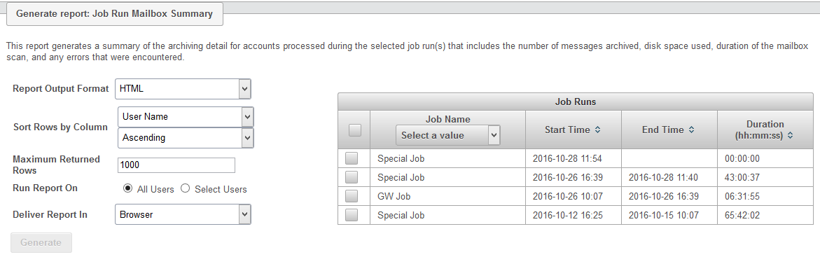 The Job Run Mailbox Summary report is much like the Job run Summary except it is dedicated to specific mailboxes and specific jobs. This job requires both a job, and a user or users to be selected.