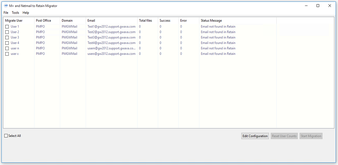 The interface has a few features, all accessed through the right-click menu. Users must be selected in the interface in order to be migrated. ONLY selected users will be migrated.